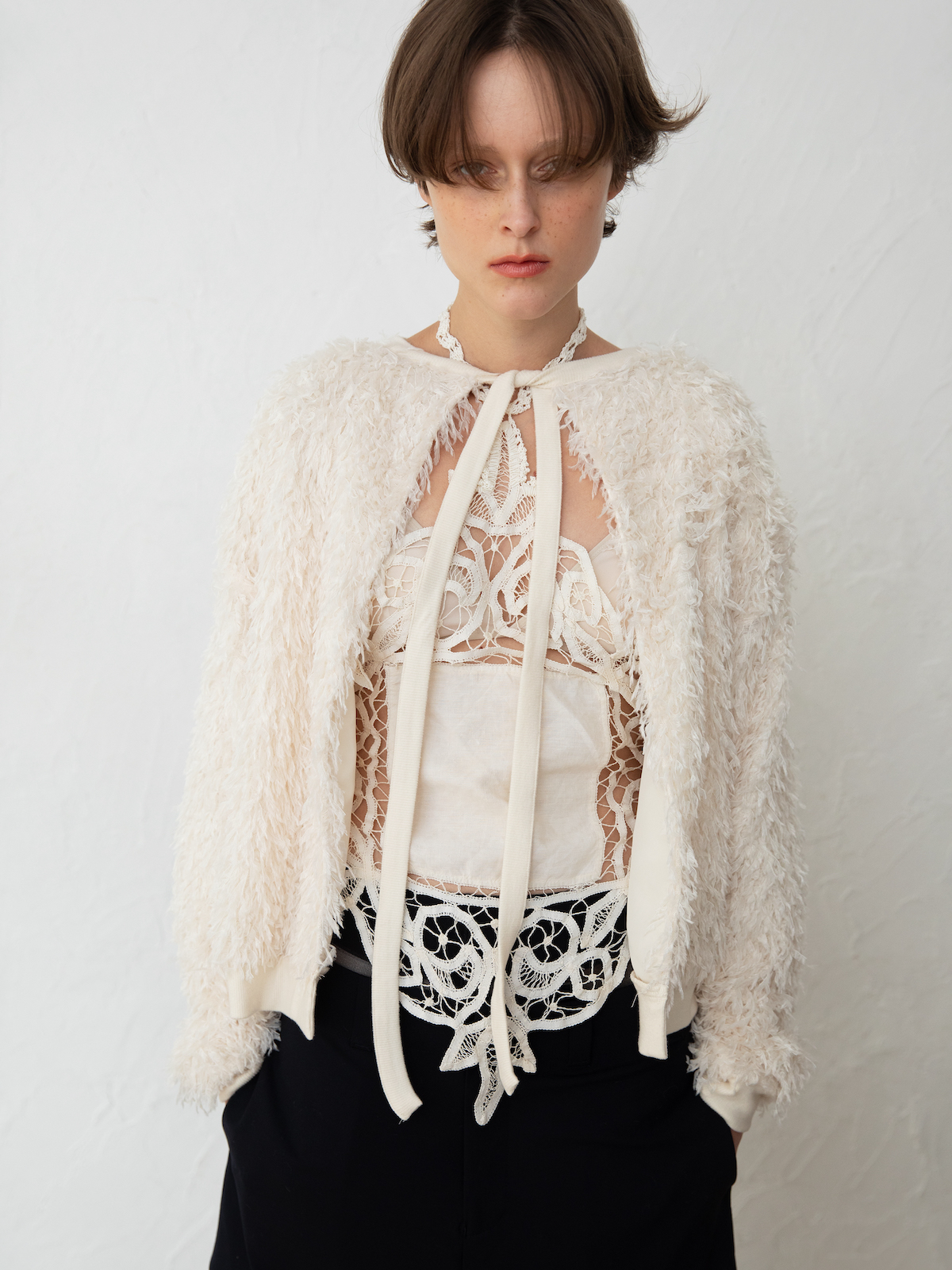 Centering antique lace, each piece is shaped with hand-crocheted knitwork and reconstructed into garments that naturally follow the contours of the modern body.